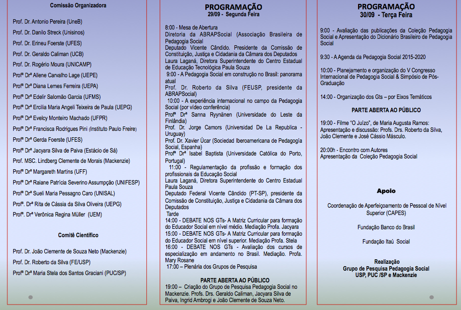 Pedagogia Social em Construção no Brasil: Encontro Internacional de Grupos de Pesquisa. São Paulo, Universidade Mackenzie, 29 e 30 de setembro 2014. Trata-se de reunião de caráter acadêmico científico entre líderes de grupos de pesquisas registrados no Diretório de Grupos de Pesquisas do CNPq e que tem a Pedagogia Social como referencial teórico para suas práticas. A coordenação e articulação desta área é feita a partir de três IES sediadas em São Paulo – Mackenzie, USP e PUC – e os grupos de pesquisas estão descentralizados em diversas IES por todas as regiões do país. Não seria possível organizar esta reunião sem o apoio financeiro da CAPES e a liberação dos pesquisadores por parte de suas instituições. Consulte aqui o Programa