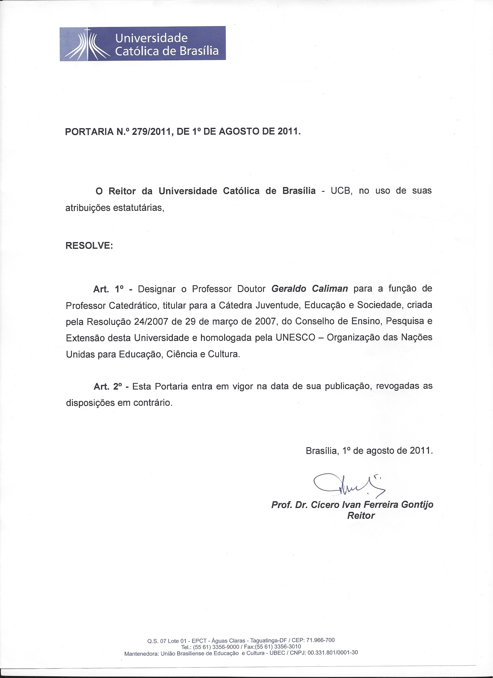 Portaria de Nomeação para a Cátedra UNESCO de Juventude, Educação e Sociedade