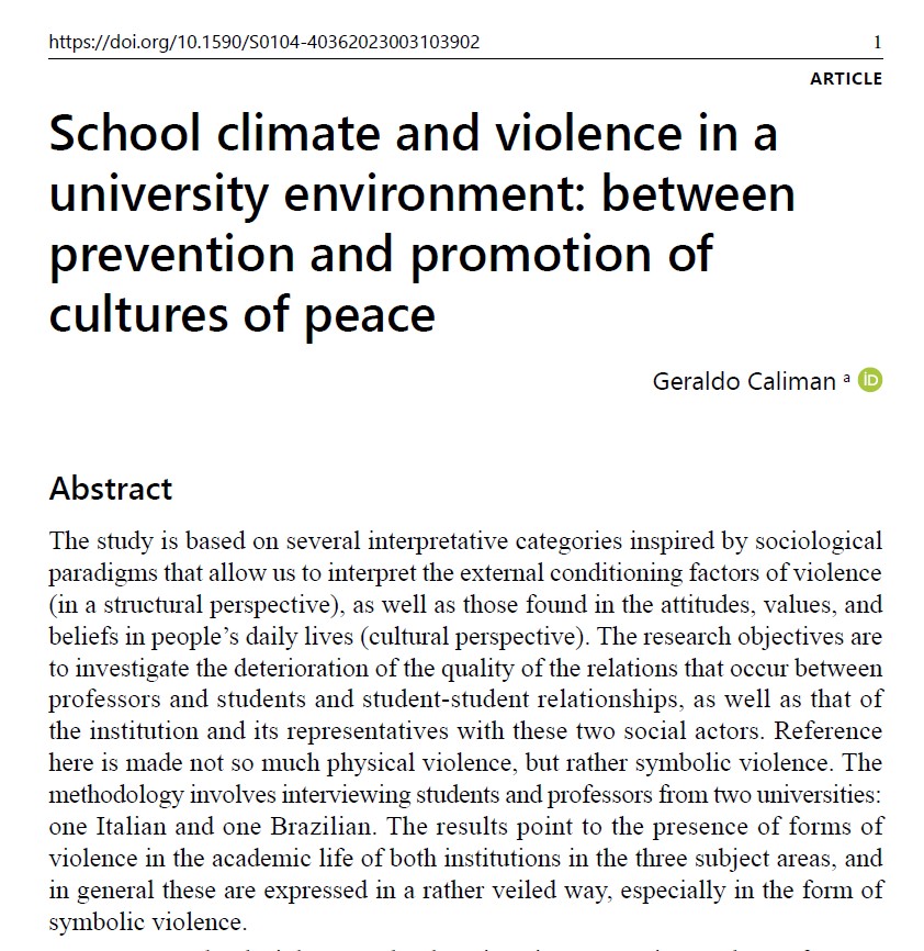 CALIMAN, G. School climate and violence in a university environment: between prevention and promotion of cultures of peace. Revista Ensaio, 2023. https://doi.org/10.1590/S0104-40362023003103902 Publicado 19Set23