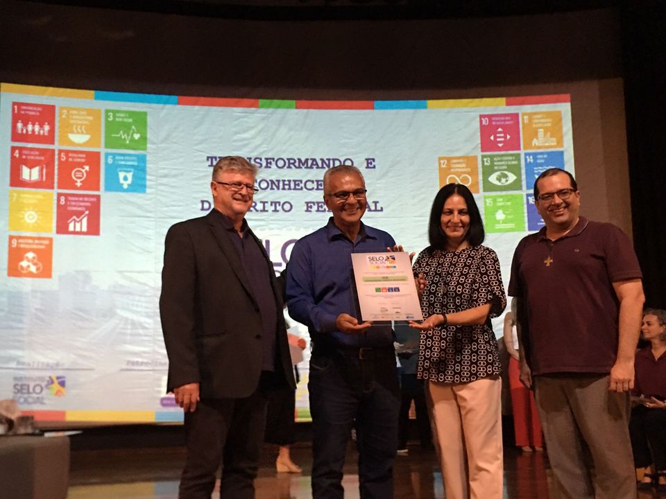Universidade Católica de Brasília (UCB) recebe o Selo Social pelos seus programas sociais desenvolvidos sobretudo na área da extensão universitária. Alguns desses programas possuem a parceria com a Cátedra Unesco de Juventude, Educação e Sociedade. Receberam a placa comemorativa em nome da UCB os professores MsC. José Ivaldo de Araújo Lucena, Coordenador da Extensão na UCB, e o Prof. Dr. Geraldo Caliman, Coordenador da Cátedra Unesco de Juventude, Educação e Sociedade.