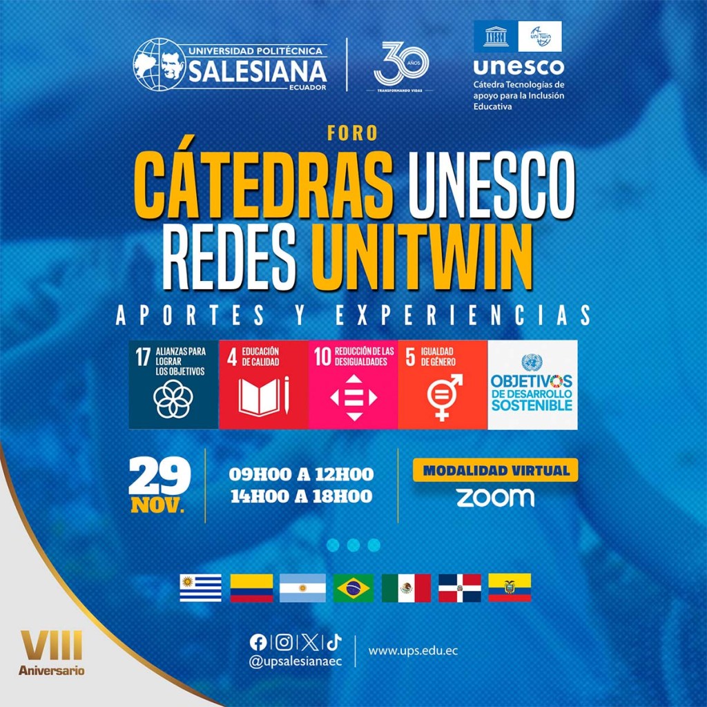 O Prof. Geraldo Caliman falou sobre as atividades da Cátedra UNESCO de Juventude, Educação e Sociedade, no “Fórum Internacional de Cátedras UNESCO – Redes UNITWIN”. Contribuições e Experiências”, organizado pela Cátedra UNESCO de Tecnologias de Apoio à Inclusão Educacional da Universidade Politécnica Salesiana do Equador, com a participação de Cátedras UNESCO de diferentes Universidades Latino-Americanas, que aconteceu no inteiro dia 29 de novembro, entre os 9h e 18h (horário de Quito).