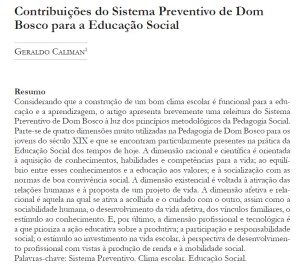 CALIMAN, G. Contribuições do sistema preventivo de Dom Bosco para a Educação Social. Revista de Ciências da Educação, Americana, ano XXI, n. 45, p. 69-86, jul./dez. 2019.